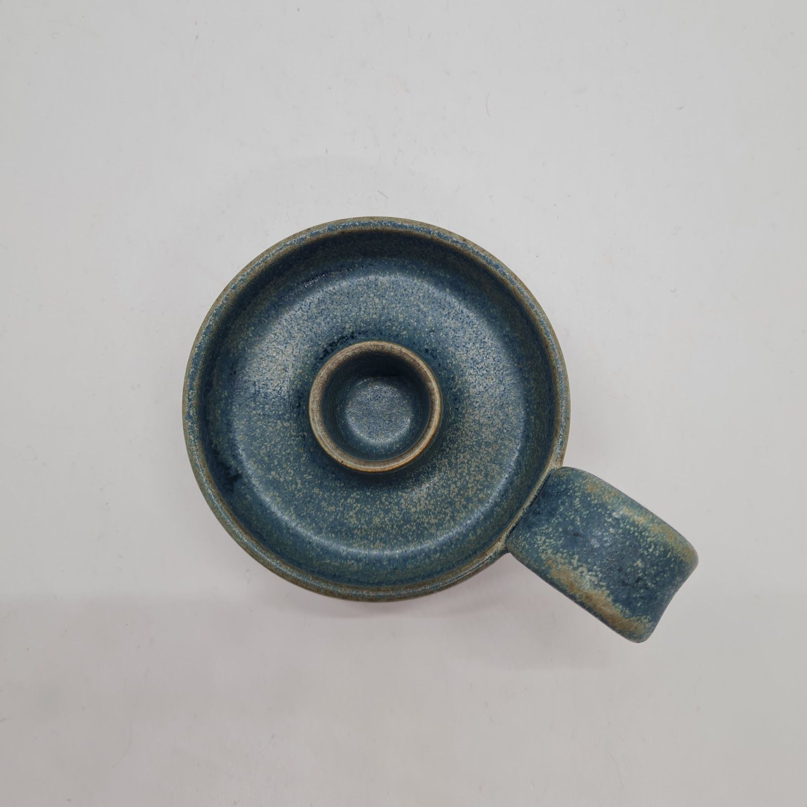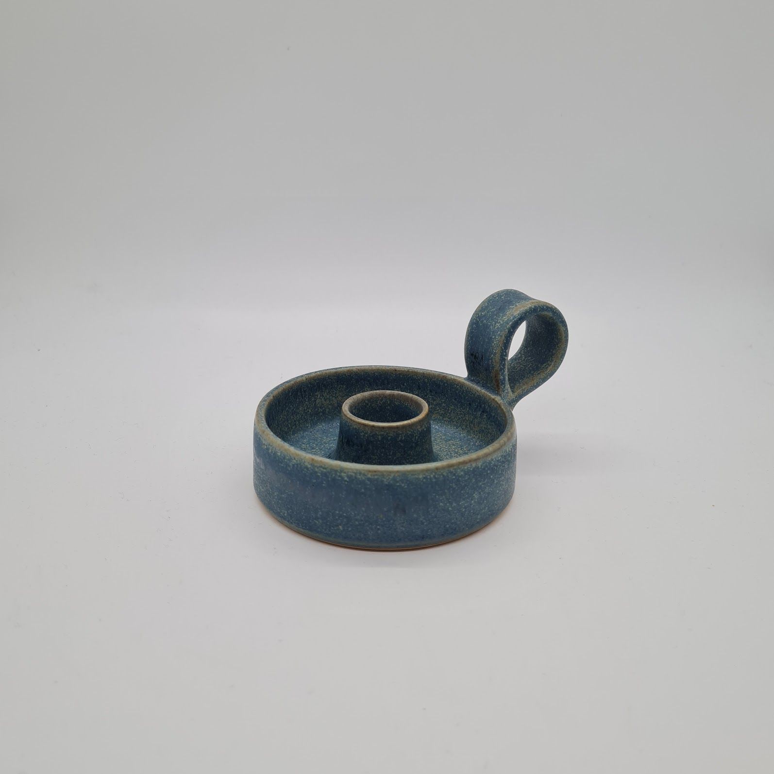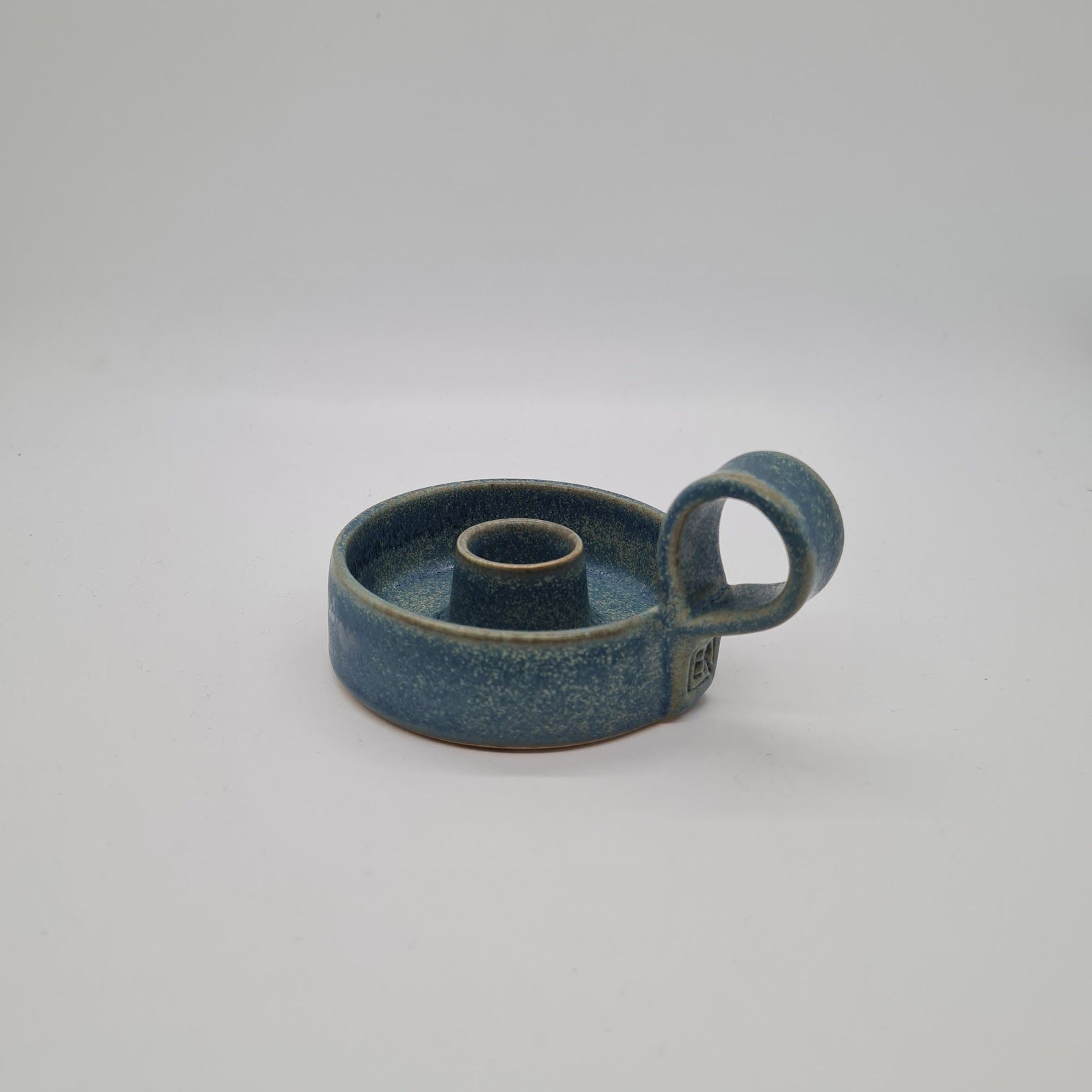 Denne lysestage er drejet i lyst stentøjsler. Den har fået en blågrøn silkemat glasur. Stagen passer til almindelige kronelys.