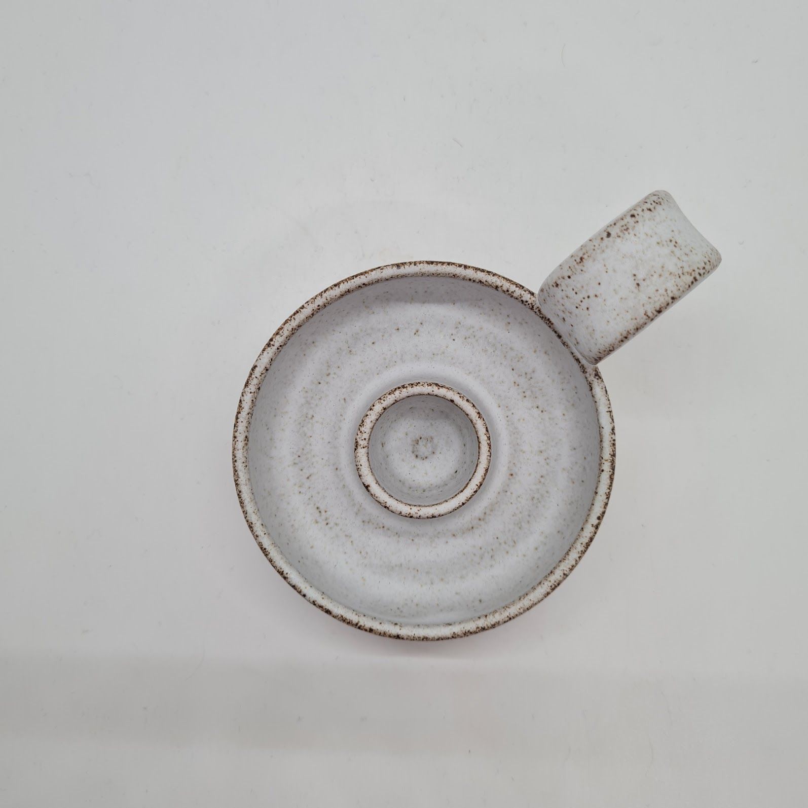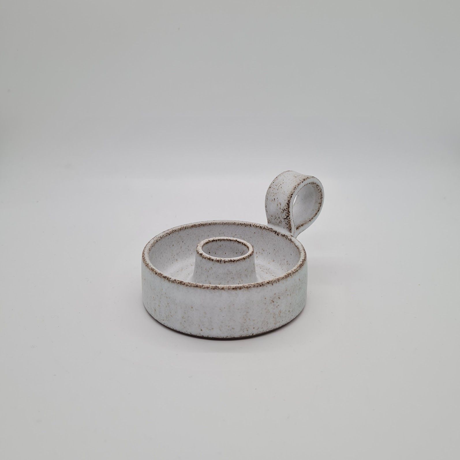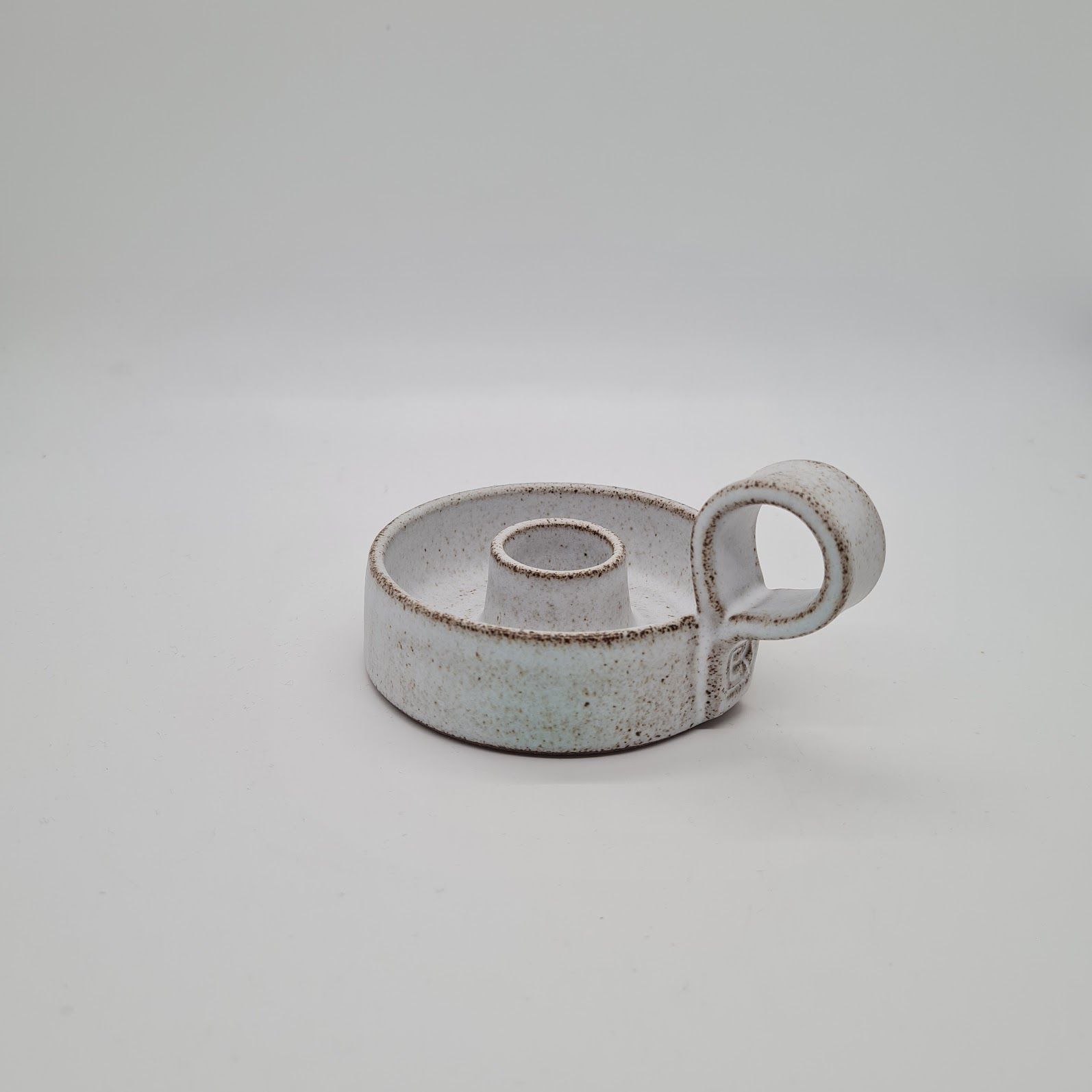 Denne lysestage er drejet i gråt stentøjsler. Den har fået en mat hvid glasur der gennemtrænges fint af den grå ler. Stagen passer til almindelige kronelys.