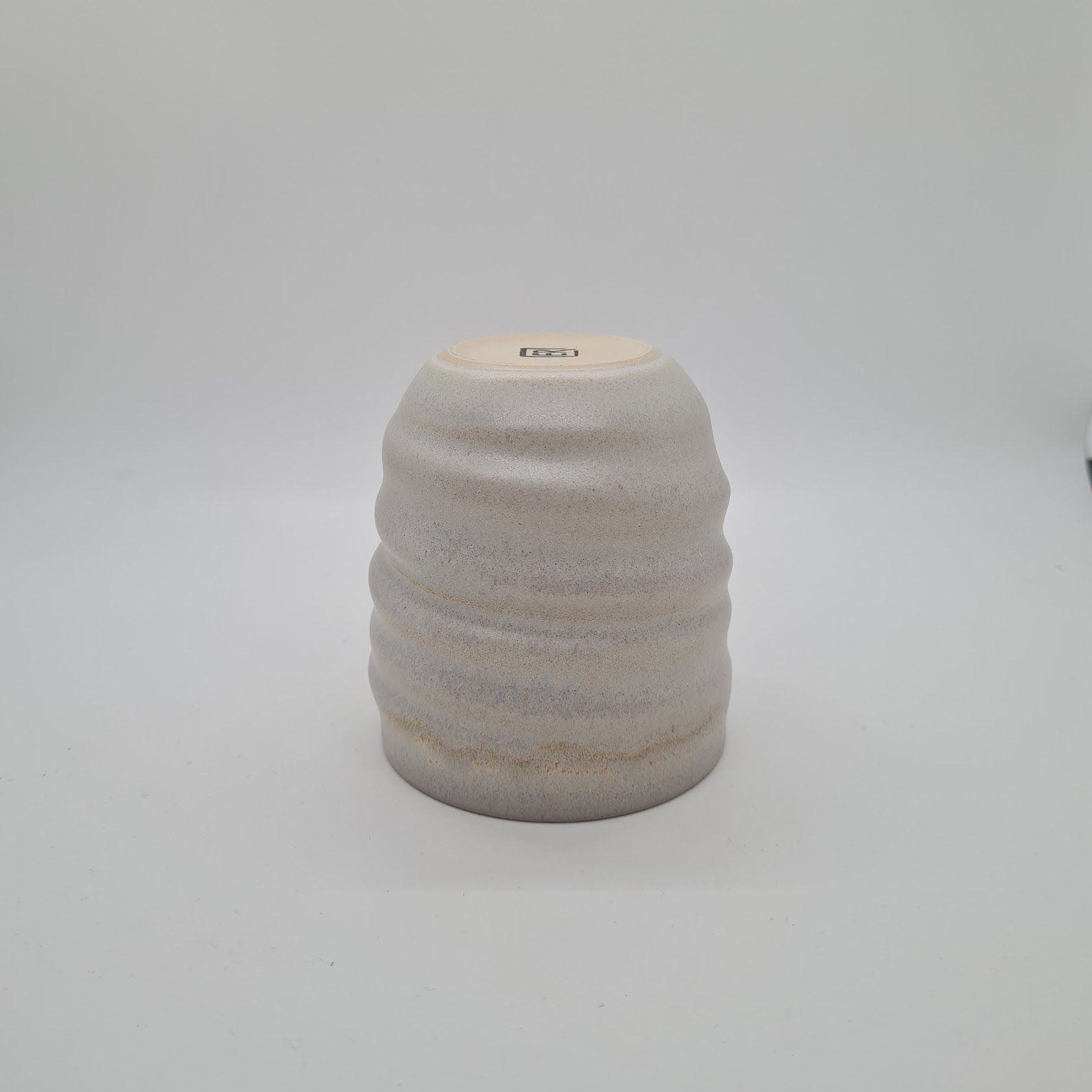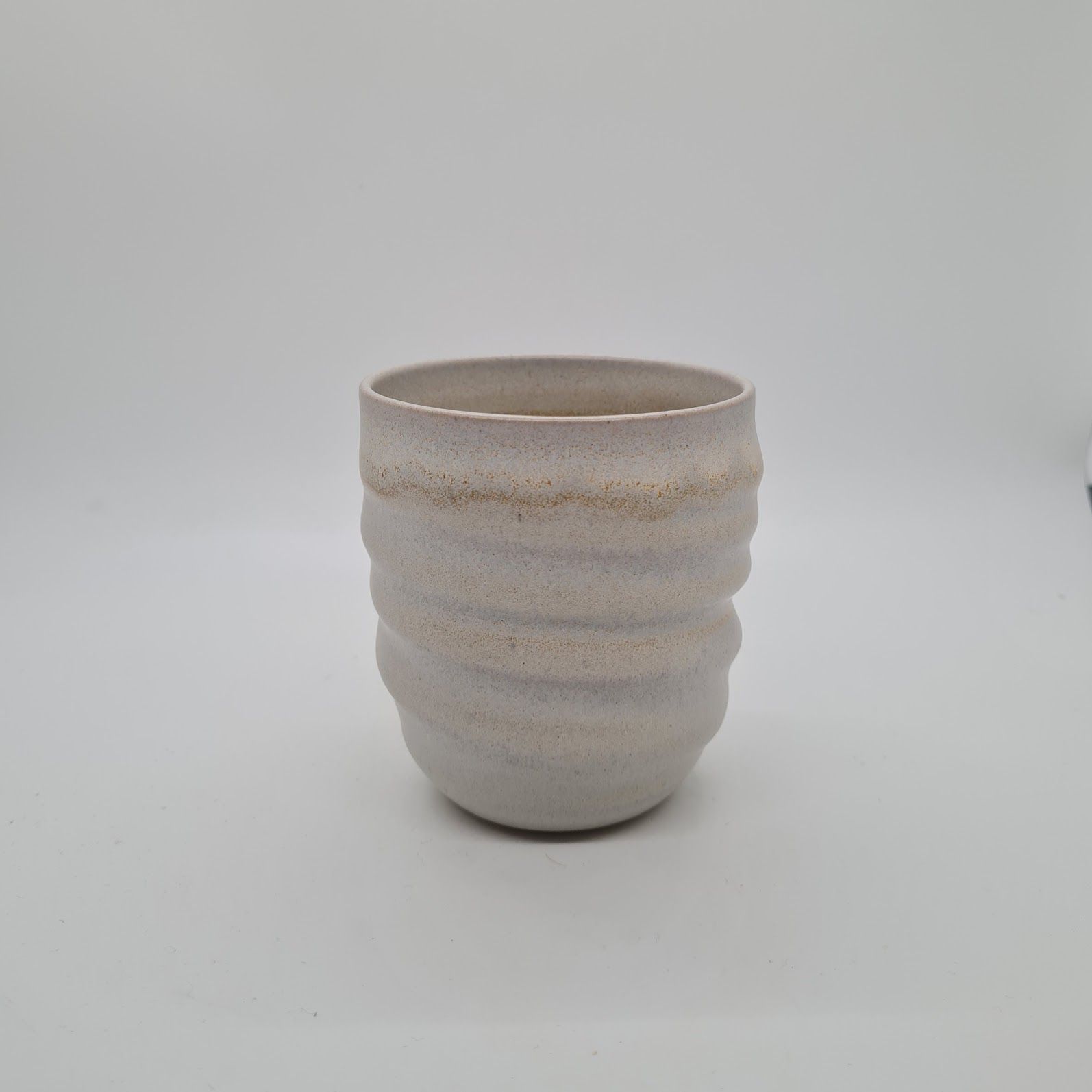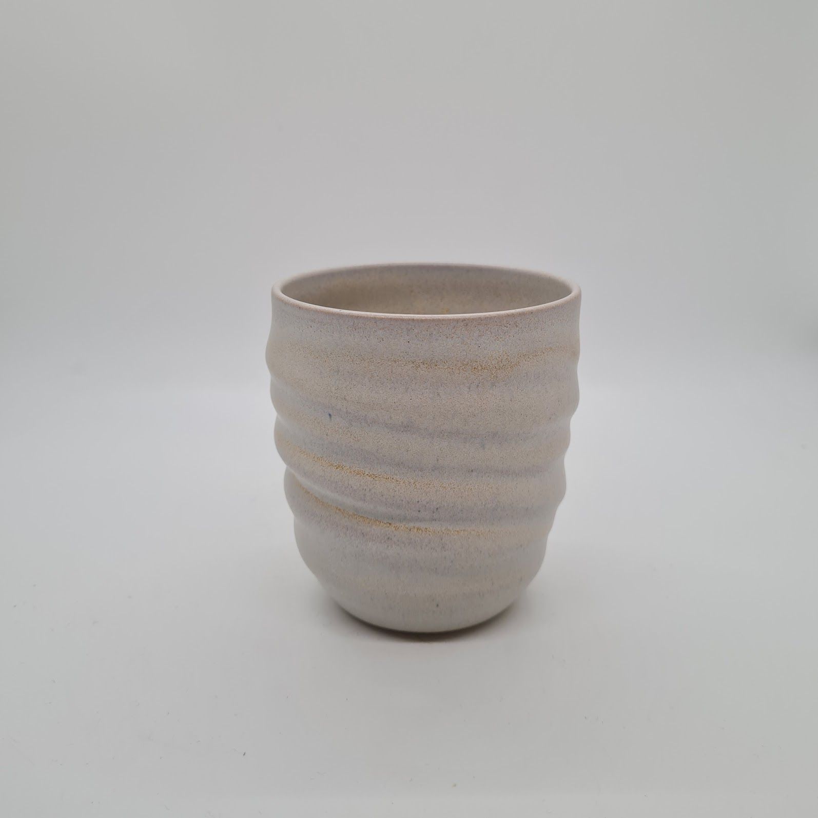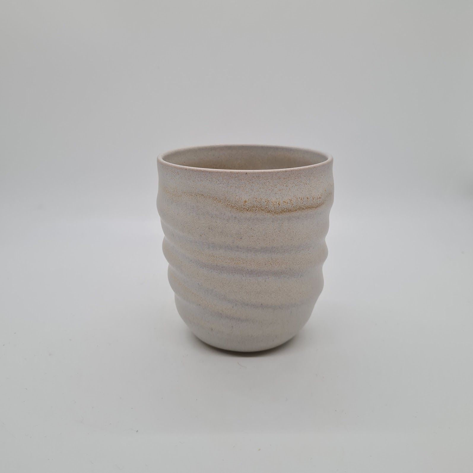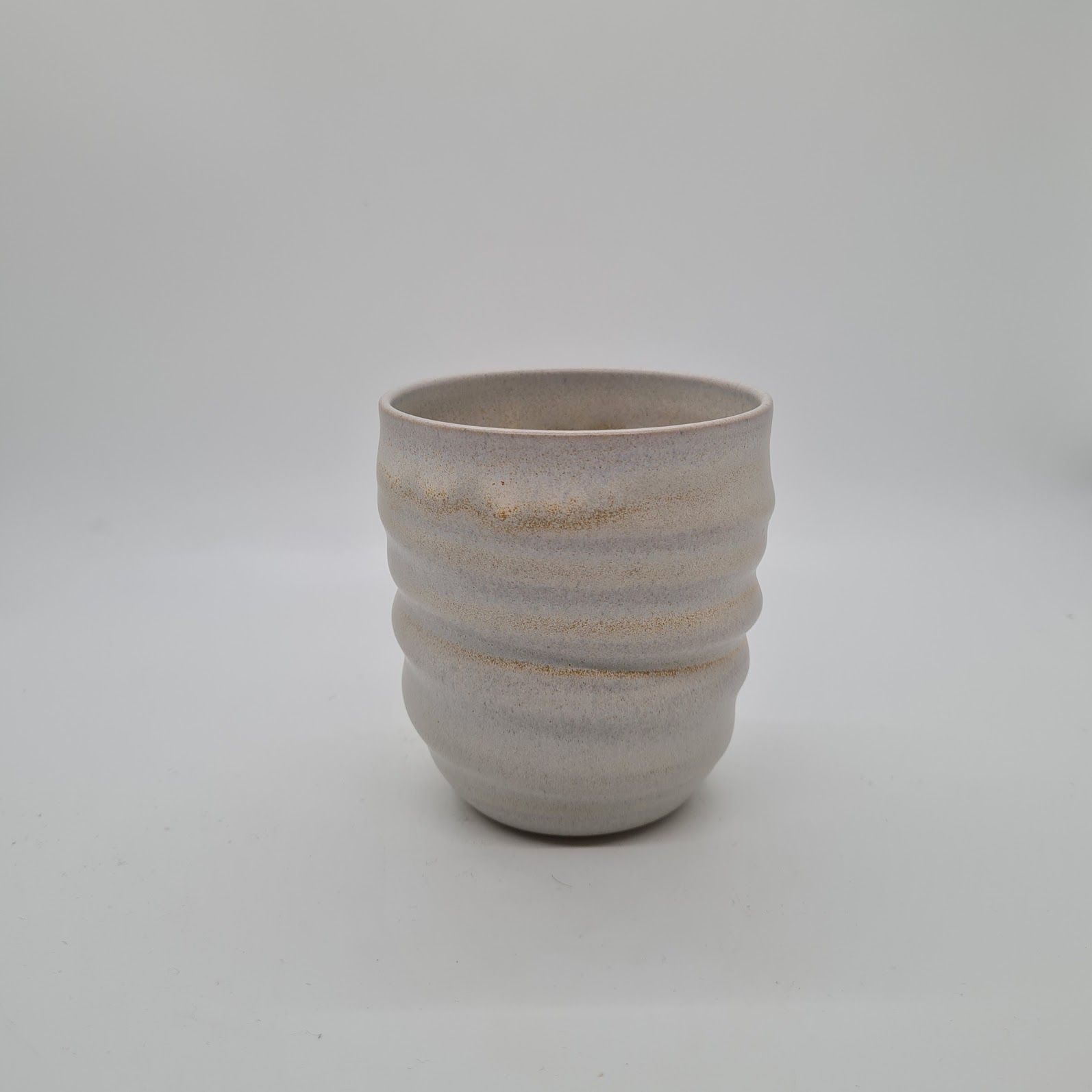 Dette krus er drejet i lyst stentøjsler. Kruset er med det sidste optræk i drejeprocessen givet et let asymmetrisk udtryk ved at “trække op” hurtigere end drejeskivens hastighed.