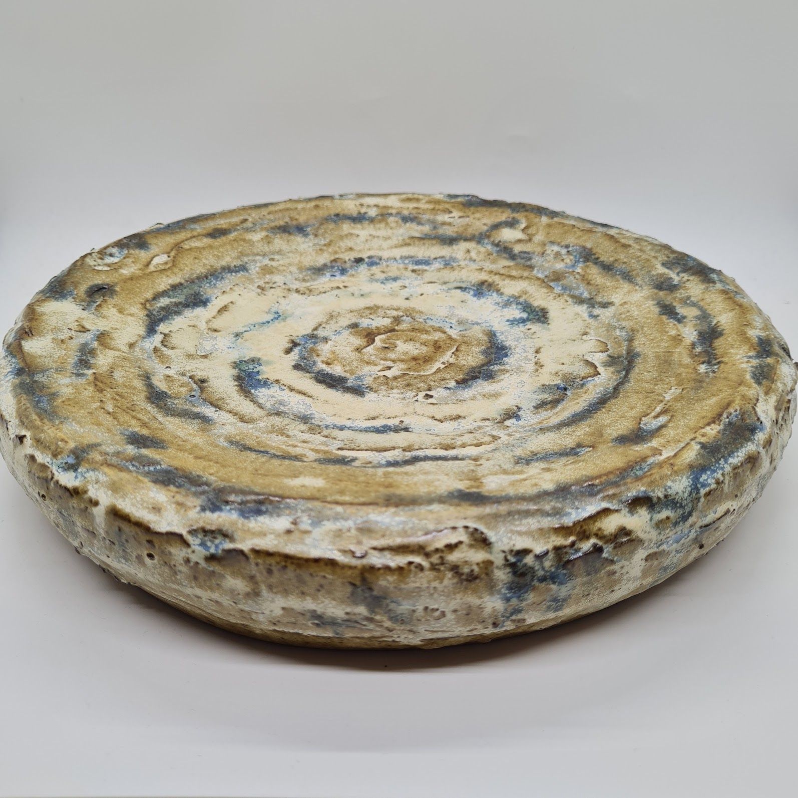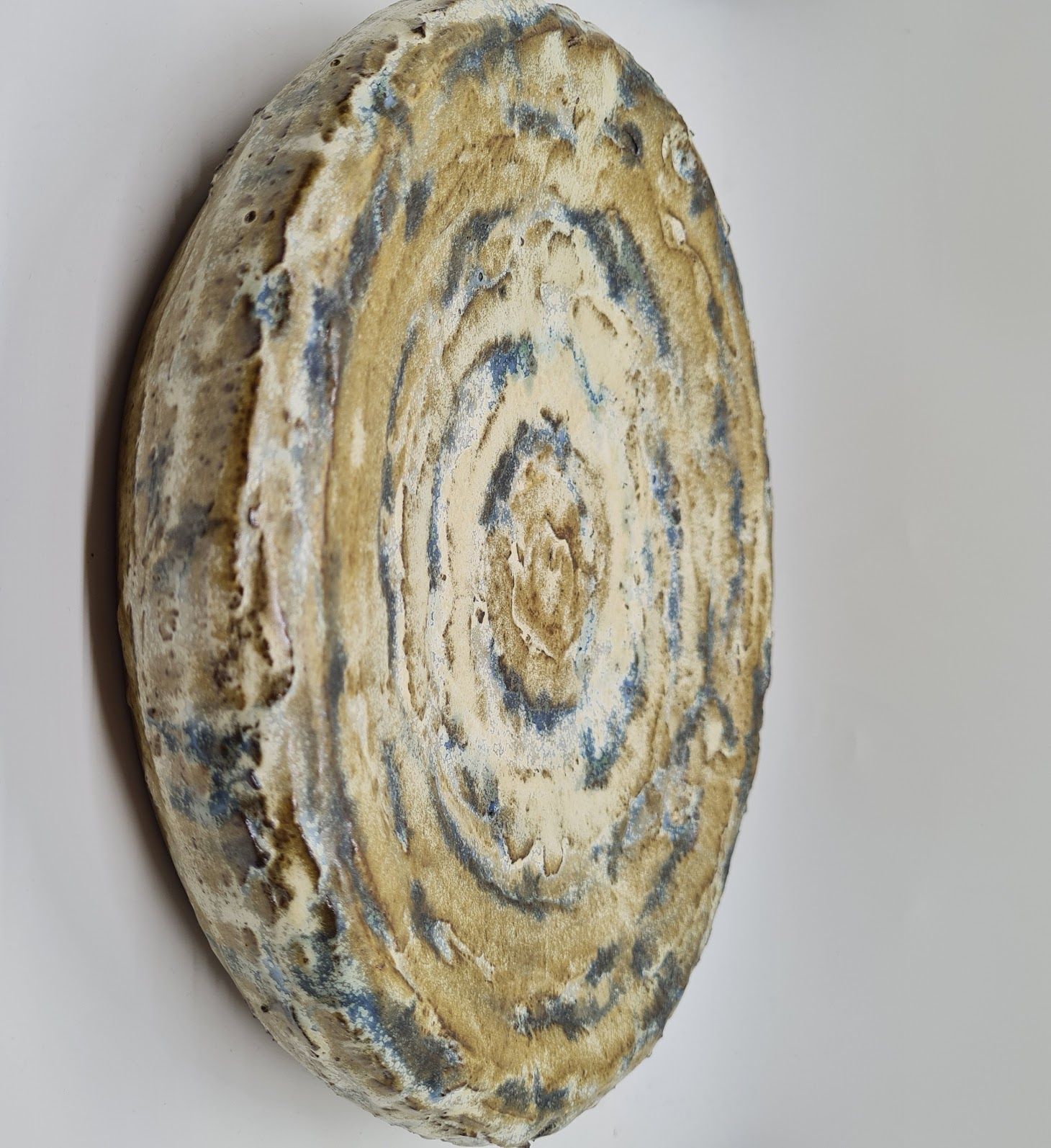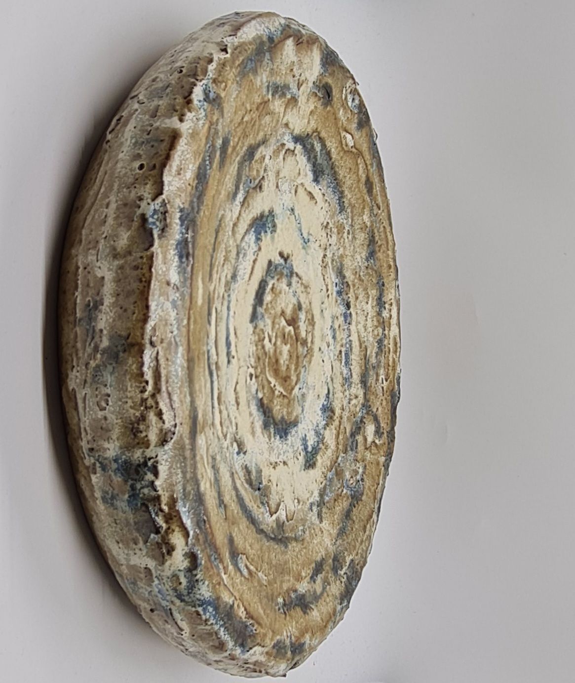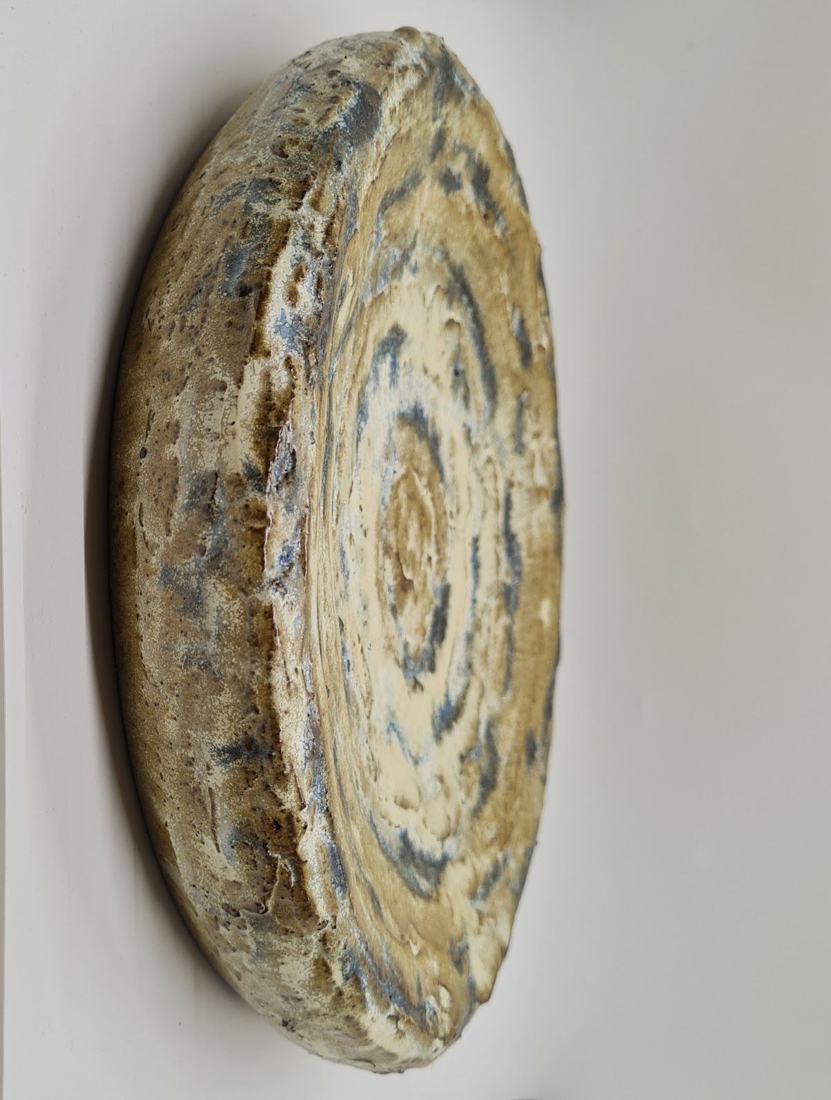 Dette vægophæng er drejet i stentøjsler og har fået glasurer i naturens lyse brunlige nuancer, samt cirkulære linjer af koboltoxid, som trænger fint gennem glasuren. Vægstykket kan vendes/hænges på flere måder på væggen.