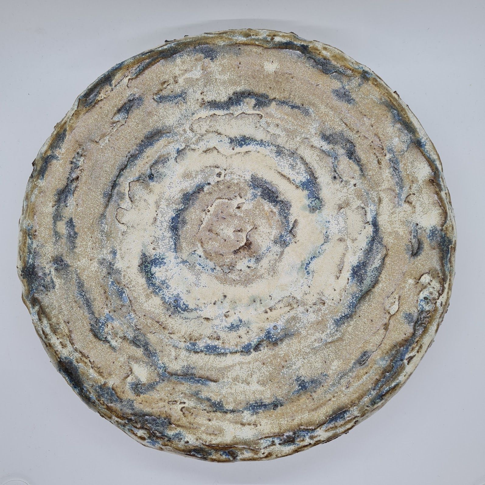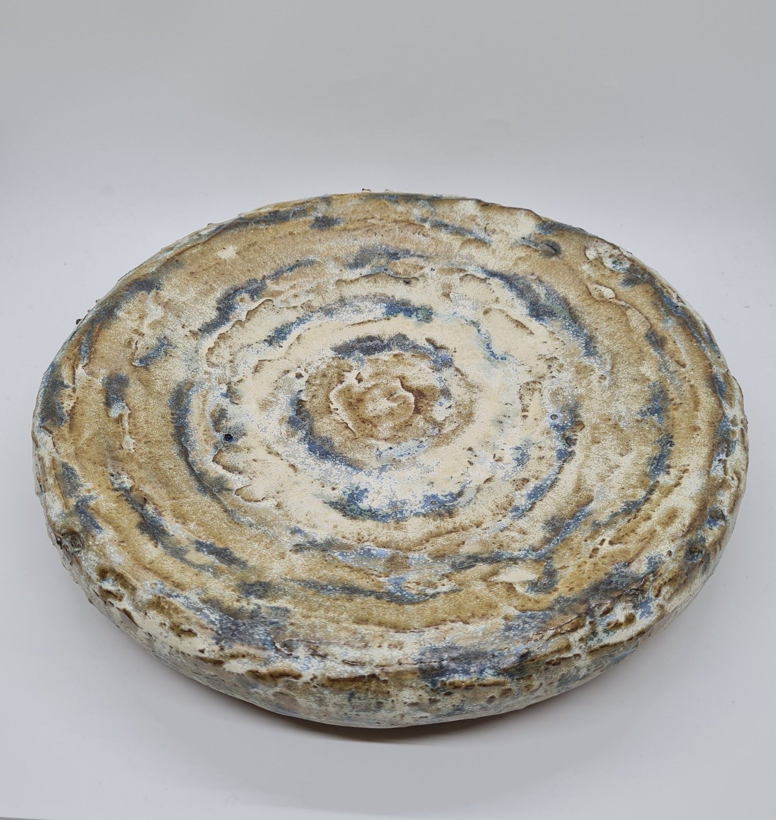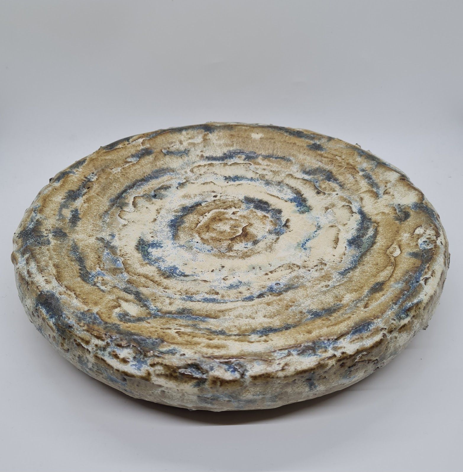 Dette vægophæng er drejet i stentøjsler og har fået glasurer i naturens lyse brunlige nuancer, samt cirkulære linjer af koboltoxid, som trænger fint gennem glasuren. Vægstykket kan vendes/hænges på flere måder på væggen.