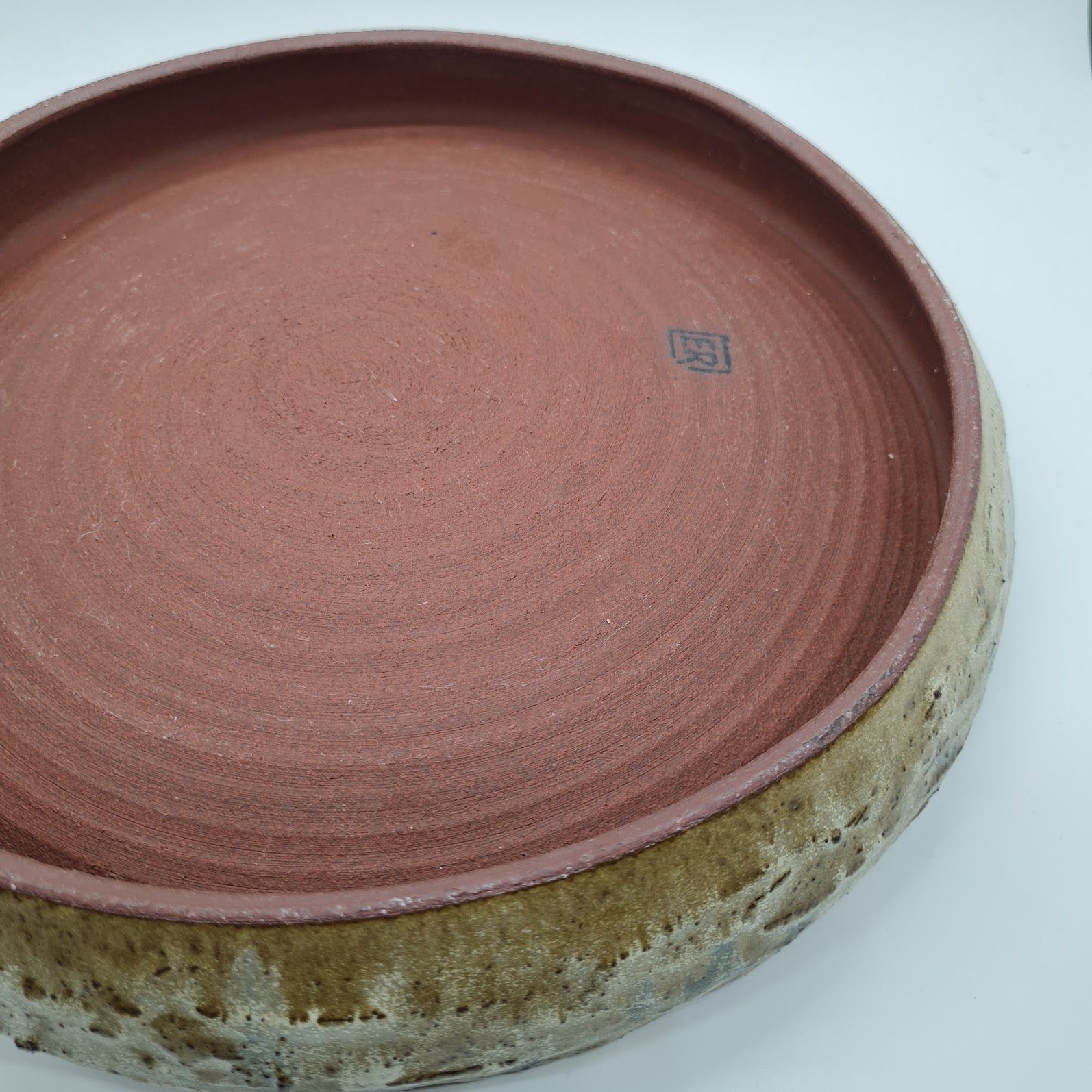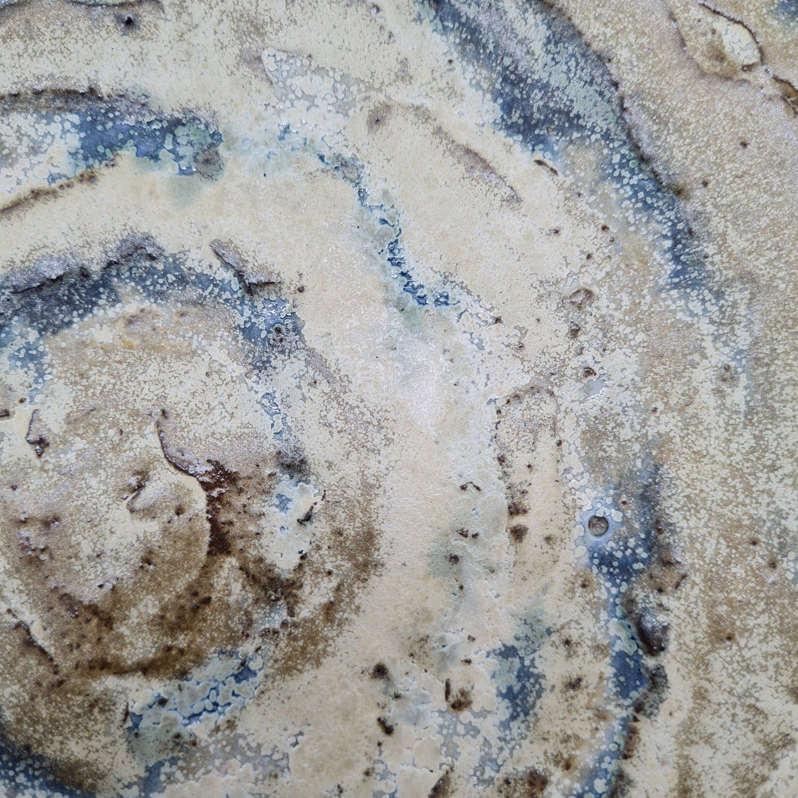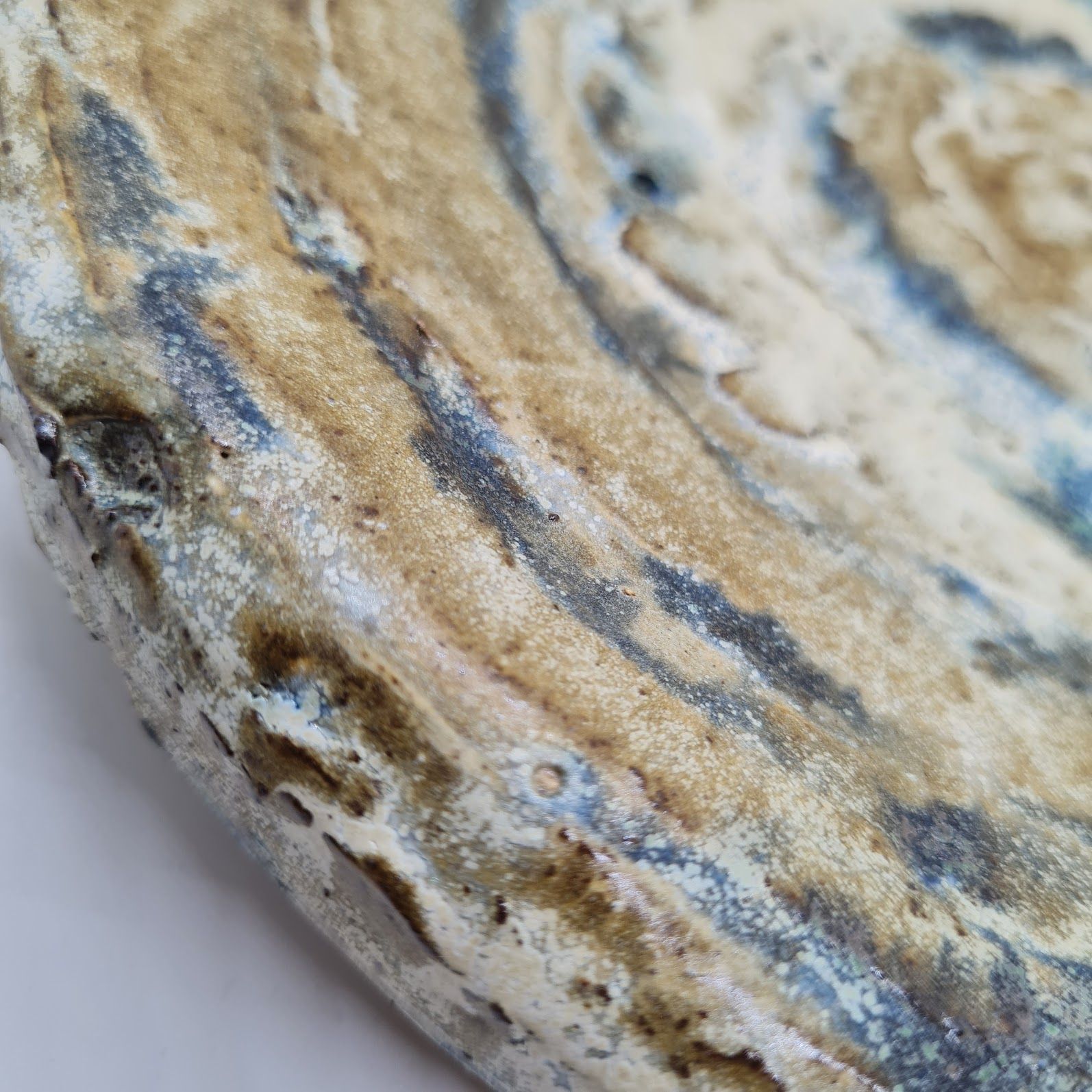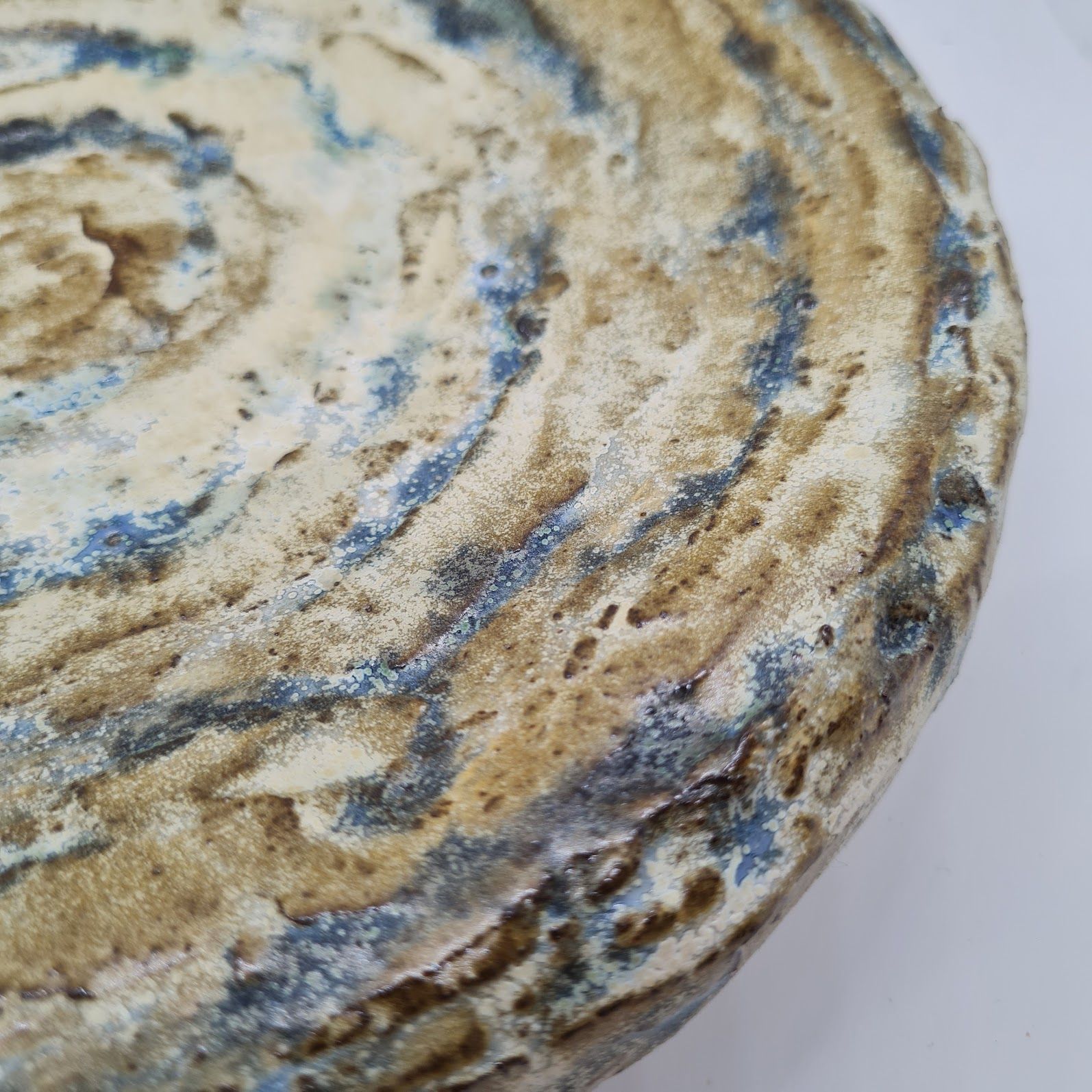 Dette vægophæng er drejet i stentøjsler og har fået glasurer i naturens lyse brunlige nuancer, samt cirkulære linjer af koboltoxid, som trænger fint gennem glasuren. Vægstykket kan vendes/hænges på flere måder på væggen.