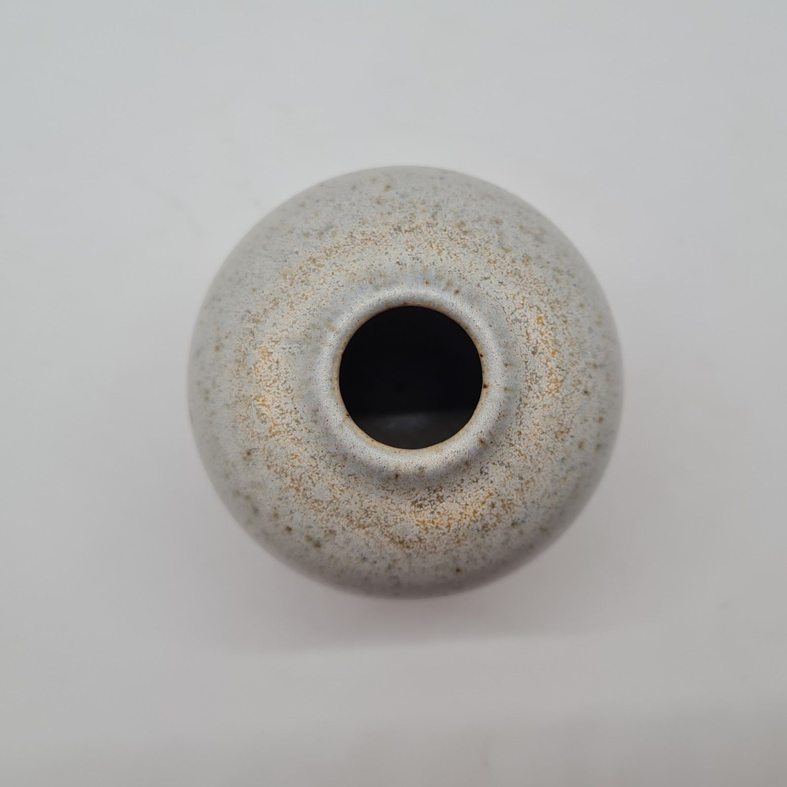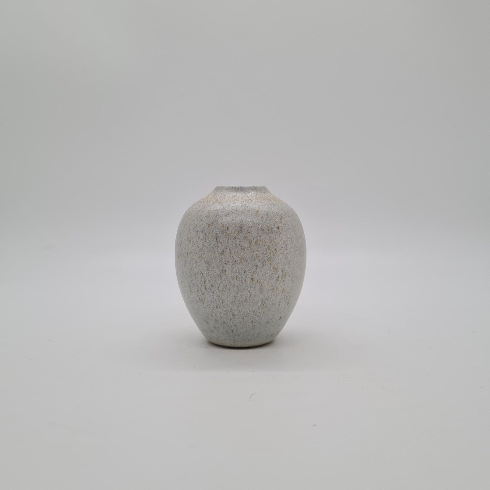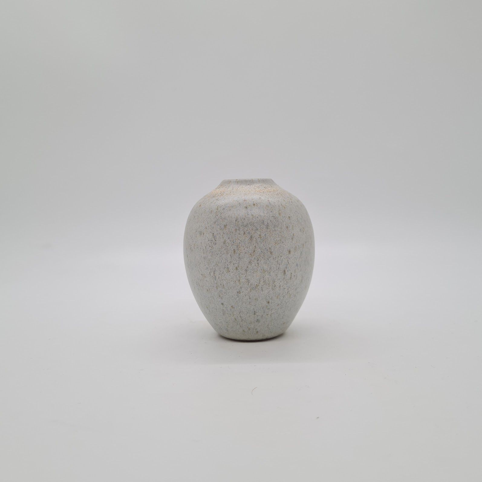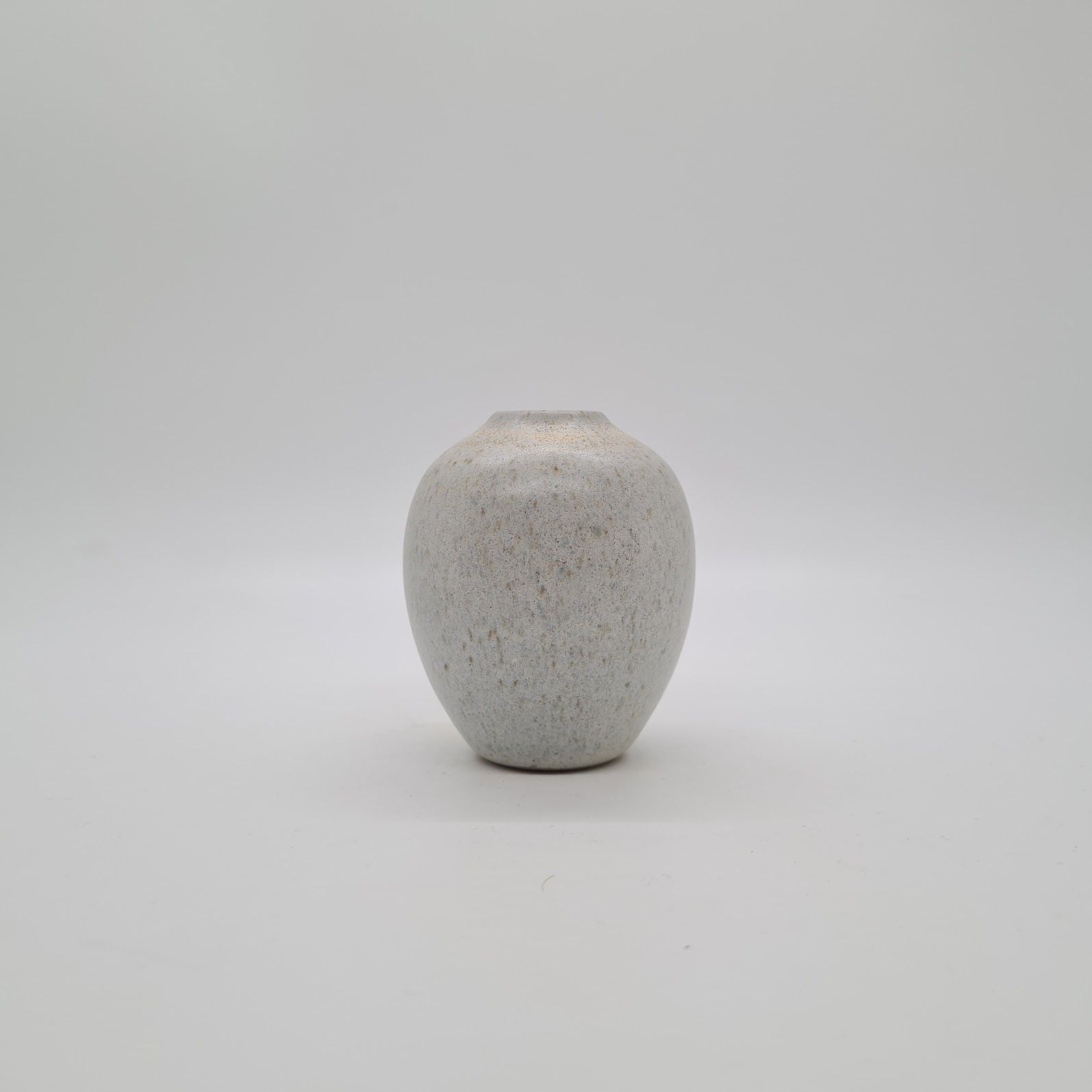 Denne lille vase er drejet i blandet stentøjsler. Den hvide halvmatte glasur gennemtrænges fint af den grove ler som laver små fine nister og hele vasen